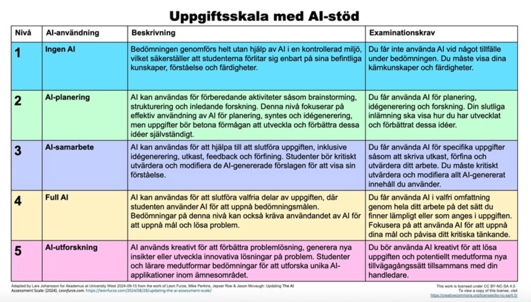 Jag gillar denna skala. Jag har alltså inte gjort den själv. Den är från Leon Furze med flera (en australiensisk AI-utbildare, samt tre till) och går att läsa i sitt original på engelska här. Bilden ovan är en översättning från Högskolan Väst och går att hitta här.
